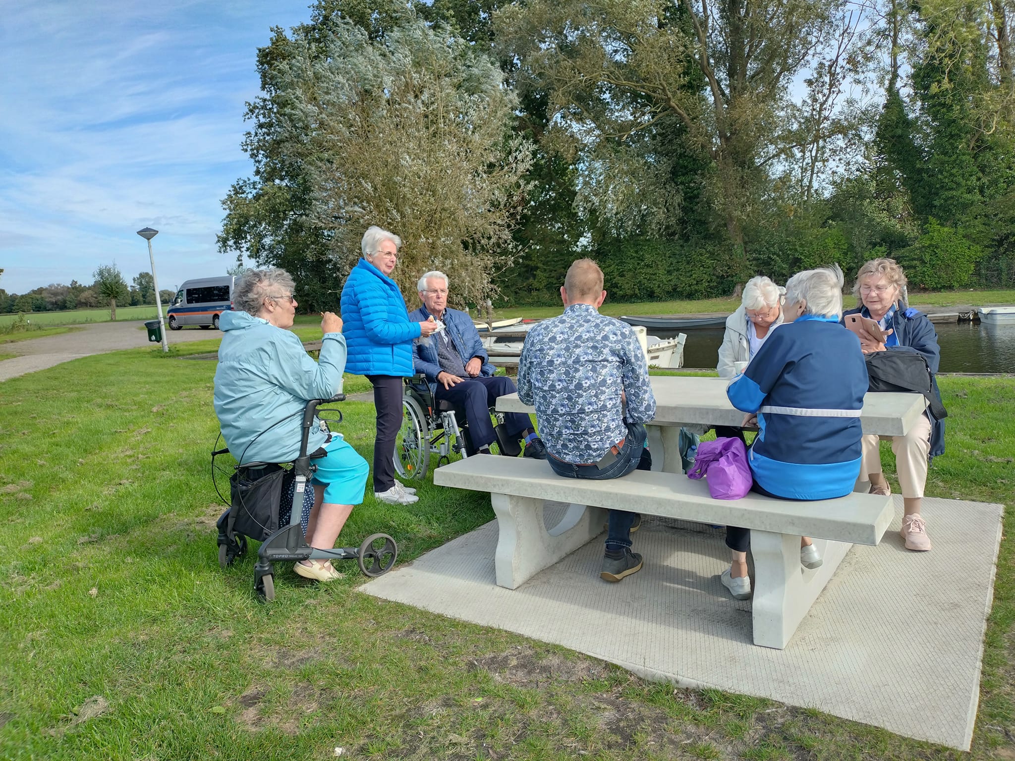 Op maandag 25 september gingen we met een kleine groep deelnemers naar Oostmahorn voor een boottocht over het Lauwersmeer. We werden van huis opgehaald en doordat we aan de vroege kant waren, konden we een toeristische route rijden en was er tijd om (door Rennie en René meegebrachte) koffie te drinken op een rustieke picknickplaats bij de Valom.